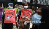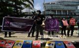 Sejumlah pengurus Aliansi Jurnalis Independen (AJI) Jakarta menggelar aksi solidaritas terhadap jurnalis Nurhadi di depan Kejaksaan Agung, Jakarta, Rabu (1/12/2021). Dalam aksi tersebut mereka meminta Kejaksaan Tinggi Jawa Timur untuk menuntut seberat-beratnya dua terdakwa aparat kepolisian yang melakukan kekerasan kepada jurnalis Tempo Nurhadi. (FOTO : Antara/Hafidz Mubarak A)