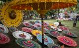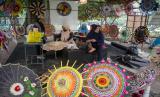 Pengrajin membuat payung rajut pada Festival Payung 2021 di Taman Balekambang, Solo, Jawa Tengah, Jumat (3/12/2021). Festival yang menampilkan berbagai seni kreasi payung tersebut digelar untuk melestarikan kerajinan payung tradisional nusantara sekaligus upaya mempertemukan pelaku industri kreatif payung dan penggiat seni karnaval. (FOTO : ANTARA/Mohammad Ayudha)