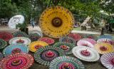Pengunjung melihat-lihat payung yang dipamerkan pada Festival Payung 2021 di Taman Balekambang, Solo, Jawa Tengah, Jumat (3/12/2021). Festival yang menampilkan berbagai seni kreasi payung tersebut digelar untuk melestarikan kerajinan payung tradisional nusantara sekaligus upaya mempertemukan pelaku industri kreatif payung dan penggiat seni karnaval. (FOTO : ANTARA/Mohammad Ayudha)