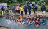 Wali Kota Bandung Oded M Danial bersama Wakil Wali Kota Bandung Yana Mulayana menyapa anak-anak yang bermain di kolam dangkal Wetland Park Cisurupan yang baru diresmikan saat Hari Bhakti PU oleh Pemkot Bandung di Kelurahan Cisurupan Kecamatan Cibiru, Kota Bandung, Jumat (3/12). Wetland Park Cisurupan adalah konsep kolam retensi yang dapat dimanfaatkan menjadi destinasi wisata. (FOTO : Edi Yusuf/Republika)