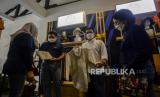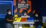 Direktur Utama Bank Mandiri Darmawan Junaidi (kiri) bersama Wakil Gubernur DKI Jakarta Ahmad Riza Patria (tengah) dan Staf Ahli Bidang Keuangan dan Pengembangan UMKM Kementerian BUMN Loto Srinaita Ginting saat membuka Festival Diskon Nasional (FDN) 2021 di M Bloc Space, Jakarta, Sabtu (4/12). FDN 2021 bertemakan Jakarta Punya Diskon yang berlangsung hingga 31 Desember 2021 itu melibatkan 12 BUMN, lebih dari 50 E-Commerce, 1.000 pengusaha lokal dan 50.000 UMKM, sebagai upaya mendorong minat masyarakat untuk berbelanja produk lokal. Republika/Putra M. Akbar (FOTO : Republika/Putra M. Akbar)