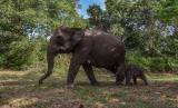 REPUBLIKA.CO.ID,PELALAWAN -- Bayi gajah sumatera (Elephas maximus sumatranus) berada di dekat kaki induknya di Taman Nasional Tesso Nilo Kabupaten Pelalawan, Riau, Jumat (3/12/2021).