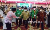 Ketua Dewan kehormatan ICMI Jusuf Kalla berbincang dengan peserta Muktamar VII dan Milad ke-31 ICMI di Hotel Grand Asrillia, Kota Bandung, Sabtu (4/12). Acara tersebut bertajuk Membangun Indonesia Bermartabat Menuju Indonesia Emas 2045, berlangsung 4-6 Desember 2021. (FOTO : Edi Yusuf/Republika)
