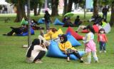 Pengunjung bersantai di arena Festival #IniJakarta, di Lapangan Banteng, Jakarta, Ahad (05/12/2021). Festival #IniJakarta merupakan kolaborasi antarwarga dan pemerintah provinsi  guna menyebar luaskan sekaligus membumikan identitas Kota Jakarta. (FOTO :  ANTARA/Akbar Nugroho Gumay/hp.)
