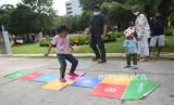 Seorang anak bermain petak gunung di Festival #IniJakarta, di Lapangan Banteng, Jakarta, Ahad (05/12/2021). Festival #IniJakarta merupakan kolaborasi antarwarga dan pemerintah provinsi  guna menyebar luaskan sekaligus membumikan identitas Kota Jakarta.  (FOTO : ANTARA/Akbar Nugroho Gumay/hp.)