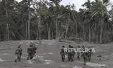 Prajurit TNI menyusuri jalur material guguran awan panas Gunung Semeru saat operasi pencarian korban di Desa Sumberwuluh, Lumajang, Jawa Timur, Senin (6/12/2021). Berdasarkan laporan Badan Nasional Penanggulangan Bencana (BNPB), jumlah korban meninggal dunia sampai Minggu (5/12) sore berjumlah 14 orang dan operasi pencarian korban oleh tim SAR gabungan masih terus berlangsung. (FOTO : ANTARA/Zabur Karuru)