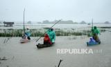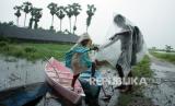REPUBLIKA.CO.ID, Seorang murid turun dari atas perahu di Kelurahan Tamangapa, Makassar, Sulawesi Selatan, Senin (6/12/2021). Sejumlah murid setempat mengaku terpaksa menggunakan perahu untuk pergi belajar ke sekolahnya akibat akses jalan di daerah itu terendam banjir.