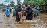 Sejumlah anggota Brimob Polda NTB mengevakuasi warga dari lokasi banjir di Dusun Kebon Lauk, Desa Sesela, Kecamatan Gunungsari, Lombok Barat, NTB, Senin (6/12/2021). Banjir yang terjadi karena hujan lebat dan luapan air Sungai Meninting di wilayah Gunungsari tersebut mengakibatkan ratusan rumah warga terendam. (FOTO : Antara/Ahmad Subaidi)