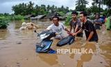 Sejumlah warga mendorong sepeda motornya melewati banjir di Dusun Kebon Lauk, Desa Sesela, Kecamatan Gunungsari, Lombok Barat, NTB, Senin (6/12/2021). Banjir yang terjadi karena hujan lebat dan luapan air Sungai Meninting di wilayah Gunungsari tersebut mengakibatkan ratusan rumah warga terendam. (FOTO : Antara/Ahmad Subaidi)