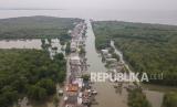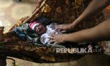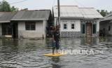 REPUBLIKA.CO.ID, BEKASI -- Seorang ibu mengasuh anaknya saat banjir rob menggenangi rumahnya di Desa Pantai Mekar, Muaragembong, Kabupaten Bekasi, Jawa Barat, Senin (6/12/2021). Banjir rob telah menggenangi wilayah tersebut selama empat hari akibat kenaikan permukaan air laut.