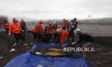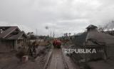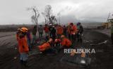 Sejumlah relawan melakukan proses evakuasi korban yang tertimbun longsoran material awan panas di Dusun Curah Kobokan, Desa Supitarang, Kabupaten Lumajang, Senin (6/12). Dusun Curah Kobokan adalah salah satu wilayah yang terdampak cukup parah akibat erupsi Gunung Semeru. Hampir semua rumah warga di lokasi itu hancur. (FOTO : Republika/Edwin Dwi Putranto)
