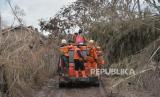 Sejumlah relawan menaiki kendaraan saat akan melakukan evakuasi korban yang diduga masih tertimbun longsoran material awan panas di Dusun Curah Kobokan, Desa Supitarang, Kabupaten Lumajang, Senin (6/12). Dusun Curah Kobokan adalah salah satu wilayah yang terdampak cukup parah akibat erupsi Gunung Semeru. Hampir semua rumah warga di lokasi itu hancur. (FOTO : Republika/Edwin Dwi Putranto)