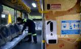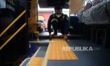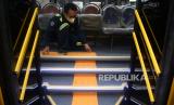 Seorang mekanik mengecek fasilitas armada bus sekolah baru di Halaman Kantor Unit Pengelola Angkutan Sekolah,Kramat Jati, Jakarta, Selasa (7/12). Pemerintah Provinsi DKI Jakarta menghadirkan 35 unit bus sekolah baru untuk peserta didik di wilayah DKI Jakarta. Bus sekolah baru ini hadir lebih modern, lebih aman, dan juga ramah untuk penyandang disabilitas.Prayogi/Republika. (FOTO : Prayogi/Republika.)
