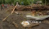 REPUBLIKA.CO.ID,LOMBOK BARAT -- Sejumlah warga melintas dekat tumpukan kayu yang terbawa banjir di Dusun Batulayar Utara, Desa Batulayar Barat, Kecamatan Batulayar, Lombok Barat, NTB, Selasa (7/12/2021).
