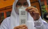 REPUBLIKA.CO.ID,TEMANGGUNG -- Seorang pelajar menunjukkan kode batang hasil cetakan saat pemilihan ketua OSIS secara e-Voting di SMK Bhumi Phala Parakan, Temanggung, Jawa Tengah, Selasa (7/12/2021).