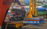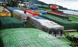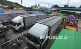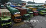 REPUBLIKA.CO.ID,MERAK -- Sejumlah truk yang akan menyeberang ke Sumatera antre di Dermaga IV saa akan masuk ke kapal ferry di Pelabuhan Merak, Banten, Selasa (7/12/2021).