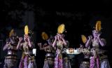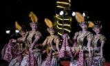 Sejumlah penari menampilkan tarian Bedhaya Sapta pada acara Gempita Budaya Jawa Barat - Yogyakarta di depan Gedung Sate, Jalan Diponegoro, Kota Bandung, Selasa (7/12). Acara tersebut digelar sebagai bentuk silaturahmi guna menciptakan hubungan yang harmonis antara Jawa Barat dan Daerah Istimewa Yogyakarta dan membangun relasi budaya serta upaya promosi potensi pariwisata. Foto: Republika/Abdan Syakura (FOTO : REPUBLIKA/ABDAN SYAKURA)
