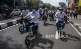 Wali Kota Bandung Oded M Danial (tengah) dan Wakil Wali Kota Bandung Yana Mulyana (kanan) beserta rombongan mengendarai kendaraan listrik di Jalan Kepatihan, Kota Bandung, Rabu (8/12). Pemerintah Kota Bandung melakukan penataan kawasan Alun-alun Kota Bandung yang meliputi Jalan Kepatihan, Jalan Dalem Kaum, Jalan Viaduct dan area Cikapundung Riverspot guna memberikan kenyamanan kepada masyarakat serta upaya menjadikan Kota Bandung sebagai kota ramah, indah dan nyaman. Foto: Republika/Abdan Syakura (FOTO : REPUBLIKA/ABDAN SYAKURA)