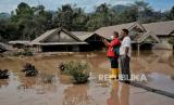 Joko bersama isterinya saat mengamati banjir yang merendam kawasan Dusun Kamar Kajang edi Gunung Semeru di Dusun Kamar Kajang, Desa Sumberwuluh, Kecamatan Candipuro, Kabupaten Lumajang, Jawa Timur, Raby (8/12). Sebanyak kurang lebih 40 rumah terendam banjir lahar dingin erupsi Gunung Semeru dari luapan sungai Hilir Curah Kobokan. Menurut Joko warga terdampak, banjir lahar dingin mulai menggenangi Dusun Kamar Kajang Pukul 18.00 WIB. Akses jalan menuju Dusun Kamar Kajang masih tertutup material erupsi, sehingga menyulitkan proses evakuasi. (FOTO : Republika/Thoudy Badai)