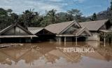 Deretan rumah yang terendam banjir lahar dingin akibat erupsi Gunung Semeru di Dusun Kamar Kajang, Desa Sumberwuluh, Kecamatan Candipuro, Kabupaten Lumajang, Jawa Timur, Raby (8/12). Sebanyak kurang lebih 40 rumah terendam banjir lahar dingin erupsi Gunung Semeru dari luapan sungai Hilir Curah Kobokan. Menurut Joko warga terdampak, banjir lahar dingin mulai menggenangi Dusun Kamar Kajang Pukul 18.00 WIB. Akses jalan menuju Dusun Kamar Kajang masih tertutup material erupsi, sehingga menyulitkan proses evakuasi. Republika/Thoudy Badai (FOTO : Republika/Thoudy Badai)