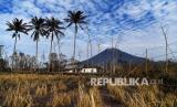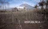 Kondisi pertanian warga yang mengering dengan latar Gunung Semeru terlihat dari Dusun Curah Koboan, Pronojiwo, Lumajang, Jawa Timur, Rabu (8/12/2021). Pusat Vulkanologi dan Mitigasi Bencana Geologi (PVMBG) menghimbau agar masyarakat tidak beraktivitas dalam radius 1 Km dari kawah Gunung Semeru dan jarak 5 kilometer arah bukaan kawah di sektor tenggara ? selatan, serta mewaspadai awan panas guguran, guguran lava, dan lahar di sepanjang aliran sungai yang berhulu di puncak Gunung Semeru. (FOTO : Antara/Zabur Karuru)