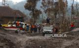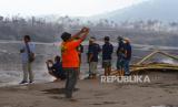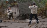 REPUBLIKA.CO.ID,LUMAJANG --Seorang pengunjung memotret rekannya usai memberikan bantuan di kawasan terdampak letusan gunung Semeru di dusun Umbulan, Pronojiwo, Lumajang, Jawa Timur, Rabu (8/12/2021).