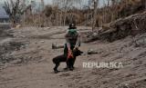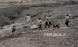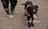Anggota Kepolisian Unit Satwa K-9 melakukan pencarian korban dengan anjing pelacak di area tambang pasir Sungai Besuk Lanang di Dusun Curah Kobokan, Kecamatan Candipuro, Kabupaten Lumajang, Jawa Timur Selasa (7/12). Proses pencarian korban di area tambang pasir tersebut dihentikan sementara akibat kondisi cuaca yang buruk dan akan dilanjutkan pada Jumat (10/12) besok. Berdasarkan Data Badan Nasional Penanggulangan Bencana (BNPB) mencatat, pada hari kelima pascaerupsi jumlah korban bertambah menjadi 43 orang. (FOTO : Republika/Thoudy Badai)