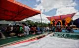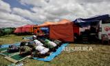 Pengungsi dan relawan melaksanakan shalat Jumat di Mobile Masjid yang terparkir di posko pengungsian Penanggal, Kecamatan Candirpuro, Kabupaten Lumajang, Jawa Timur, Jumat (10/12). Keberadaan fasilitas masjid keliling atau mobile masjid tersebut dapat membantu pengungsi dan relawan dalam melaksanakan ibadah. (FOTO : Republika/Thoudy Badai)