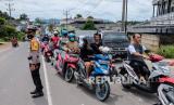 Polisi mengawasi lalu lintas saat terjadi antrian pengendara untuk mengisi bahan bakar minyak (BBM) di SPBU Kampak, Kota Pangkalpinang, Kepulauan Bangka Belitung, Sabtu (11/12/2021). Kelangkaan BBM jenis Pertalite, Premium, Solar dan Pertamax terjadi di SPBU yang ada di Provinsi Kepulauan Bangka Belitung khususnya di Kota Pangkalpinang sejak Jumat (10/12). (FOTO : Antara/Resha Juhari)
