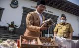 REPUBLIKA.CO.ID,BANDUNG -- Gubernur Jawa Barat Ridwan Kamil menunjukkan komoditas hortikultura saat acara pelepasan ekspor perdana produk pesantren One Pesantren One Product (OPOP) ke Dubai di Gedung Sate, Jalan Diponegoro, Kota Bandung, Senin (13/12).