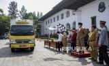 Gubernur Jawa Barat Ridwan Kamil melepas dua kontainer yang mengangkut komoditas hortikultura dan fesyen saat acara pelepasan ekspor perdana produk pesantren One Pesantren One Product (OPOP) ke Dubai di Gedung Sate, Jalan Diponegoro, Kota Bandung, Senin (13/12). Sebanyak 600 kilogram manggis, 300 kilogram rambutan, 200 kilogram salak dan 50 kilogram jengkol produk hortikultura dari pondok pesantren Al Ittifaq serta berbagai produk fesyen dari pondok pesantren Daarut Tauhid di ekspor ke Dubai. Foto: Republika/Abdan Syakura (FOTO : REPUBLIKA/ABDAN SYAKURA)