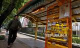 Pejalan kaki melintas di dekat papan informasi tentang kawasan Menteng di Halte Museum Proklamasi, Jakarta, Senin (13/12). Papan informasi tersebut berisi tentang lokasi dan sejarah dikawasan Menteng sekaligus memudahkan wisatawan untuk memperoleh informasi disekitaran menteng.Prayogi/Republika (FOTO : Prayogi/Republika.)