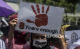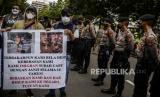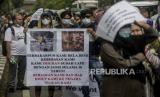 Sejumlah pencari suaka saat melaksanakan aksi di depan Kedutaan Besar Amerika Serikat, Jakarta, Senin (13/12). Pada aksinya mereka meminta keadilan dalam Hak Asasi Manusia serta menuntut UNHCR terkait kejelasan status penempatan pencari suaka di negara tujuan. Republika/Putra M. Akbar (FOTO : Republika/Putra M. Akbar)