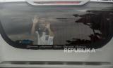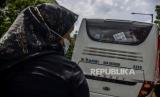 Anak-anak pencari suaka berada di dalam bus saat melaksanakan aksi di depan Kedutaan Besar Amerika Serikat, Jakarta, Senin (13/12). Pada aksinya mereka meminta keadilan dalam Hak Asasi Manusia serta menuntut UNHCR terkait kejelasan status penempatan pencari suaka di negara tujuan. Republika/Putra M. Akbar (FOTO : Republika/Putra M. Akbar)