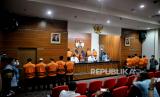 Sejumlah tersangka Anggota DPRD Kabupaten Muara Enim saat dihadirkan dalam konferensi pers penahanan tersangka di Gedung Merah Putih KPK, Jakarta, Senin (13/12). KPK resmi menahan 15 anggota DPRD Kabupaten Muara Enim terkait dugaan suap uang ketok palu pengesahan APBD di Kabupaten Muara Enim dan penerimaan hadiah atau janji dalam pengadaan barang dan jasa di Dinas PUPR. (FOTO : Republika/Thoudy Badai)