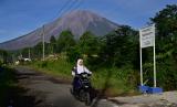 Seorang anak berangkat sekolah dengan latar belakang Gunung Semeru di Sumbermujur, Candipuro, Lumajang, Jawa Timur, Selasa (14/12/2021). Dinas Pendidikan Kabupaten Lumajang menyediakan tenda darurat untuk menggelar pendidikan karena sebagian sekolahan masih digunakan sebagai posko pengungsian dan logistik. (FOTO : ANTARA/Budi Candra Setya)