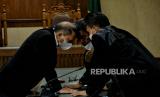 Terdakwa mantan Direktur Utama PT Pelabuhan Indonesia (Pelindo) II (Persero) Richard Joost Lino atau RJ Lino berdiskusi bersama penasehat hukum saat menjalani sidang putusan di Pengadilan Tipikor, Jakarta, Selasa (14/12). RJ Lino divonis 4 tahun penjara denda Rp500 juta subsider 6 bulan kurungan karena terbukti melakukan tindak pidana korupsi dalam pengadaan dan pemeliharaan 3 unit QCC tahun 2010 di pelabuhan Panjang (Lampung), Pontianak (Kalimantan Barat) dan Palembang (Sumatera Selatan) sehingga mengakibatkan kerugian negara sebesar 1.997.740,23 dolar AS. Republika/Thoudy Badai (FOTO : Republika/Thoudy Badai)