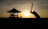 Petugas kebersihan membersihkan sampah dengan latar belakang matahari terbit di Pantai Sanur, Bali, Rabu (15/12/2021). Panorama matahari terbit menjadi daya tarik wisatawan yang berkunjung ke Pantai Sanur. (FOTO : ANTARA/Rivan Awal Lingga)