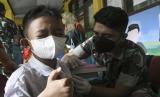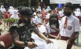 REPUBLIKA.CO.ID,BEKASI -- Prajurit TNI mendata pelajar yang akan mengikuti vaksin COVID-19 di Harapan Mulya 02, Bekasi, Jawa Barat, Rabu (15/12/2021).
