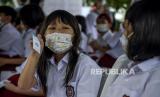 REPUBLIKA.CO.ID,BANDUNG -- Vaksinator menyuntikkan vaksin Covid-19 ke siswa Sekolah Dasar (SD) saat pelaksanaan vaksinasi Covid-19 bagi anak usia 6-11 tahun di Taman Dewi Sartika, Jalan Wastukencana, Kota Bandung, Kamis (16/12).