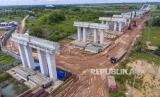 REPUBLIKA.CO.ID, PALEMBANG -- Foto udara pengerjaan proyek Jalan Tol Trans Sumatera ruas Kayu Agung-Palembang-Betung (Kapal Betung) seksi II Jalintim Musi Landas di Desa Pulo Kerto, Gandus, Palembang, Sumatera Selatan, Kamis (16/12/2021).