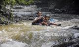 Sejumlah anak bermain river tubing dan river boarding saat aksi bersih sungai di aliran Sungai Cikapundung, Kota Bandung, Jumat (17/12). Aksi bersih sungai yang bertajuk Cleanup Day tersebut merupakan bentuk kepedulian sekaligus salah satu upaya edukasi kepada warga dalam menjaga kebersihan sungai. Foto: Republika/Abdan Syakura (FOTO : REPUBLIKA/ABDAN SYAKURA)
