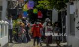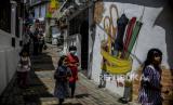 Anak-anak berjalan di dekat tembok bergambarkan mural di Kampung Perca, Sindangsari, Kota Bogor, Jawa Barat, Jumat (17/12). Kampung Perca yang memproduksi berbagai macam produk kerajinan dengan menggunakan bahan kain sisa tersebut menjadi destinasi wisata baru di Kota Bogor serta memberdayakan ekonomi masyarakat. Republika/Putra M. Akbar (FOTO : Republika/Putra M. Akbar)