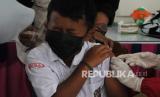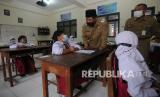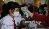 REPUBLIKA.CO.ID, BOYOLALI -- Petugas kesehatan mengecek suhu seorang siswa sekolah dasar yang akan menerima vaksinasi COVID-19 di SD Negeri 1 Boyolali, Jawa Tengah, Senin (20/12/2021). Pemerintah Kabupaten Boyolali menargetkan sebanyak 95.426 pelajar sasaran siswa sekolah dasar usia 6 hingga 11 tahun tervaksin COVID-19 yang diharapkan kegiatan belajar mengajar dapat kembali secara normal.