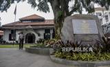 Petugas keamanan beraktivitas di halaman Gedung Indonesia Menggugat yang termasuk bangunan cagar budaya golongan A di Jalan Perintis Kemerdekaan, Kota Bandung, Senin (20/12). Pemerintah Kota Bandung menetapkan 1.770 bangunan sebagai cagar budaya yang dibagi dalam tiga golongan yakni golongan A, B dan C. Hal tersebut berdasarkan Peraturan Daerah (Perda) Kota Bandung Nomor 7 tahun 2018 tentang Pengelolaan Cagar Budaya. Foto: Republika/Abdan Syakura (FOTO : REPUBLIKA/ABDAN SYAKURA)