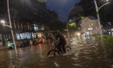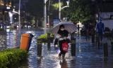 Pejalan kaki berjalan melewati banjir yang menggenangi Jalan Kemang Raya, Jakarta Selatan, Senin (20/12/2021). Hujan deras yang mengguyur sebagian Jakarta membuat sejumlah wilayah di Ibu Kota terendam banjir. (FOTO : ANTARA/Sigid Kurniawan)