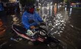 Pesepeda motor melewati banjir yang menggenangi Jalan Kemang Raya, Jakarta Selatan, Senin (20/12/2021). Hujan deras yang mengguyur sebagian Jakarta membuat sejumlah wilayah di Ibu Kota terendam banjir. (FOTO : ANTARA/Sigid Kurniawan)