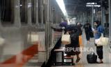 Penumpang menaiki kereta api jarak jauh di Stasiun Senen, Jakarta, Selasa (21/12). Jelang libur Natal dan Tahun Baru kepadatan penumpang kereta api jarak jauh mulai terlihat di stasiun Senen.Prayogi/Republika (FOTO : Prayogi/Republika.)