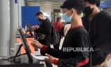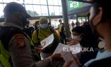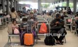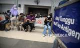 Sejumlah penumpang kereta api menunggu hasil swab antigen di Stasiun Senen, Jakarta, Selasa (21/12). Jelang libur Natal dan Tahun Baru kepadatan penumpang kereta api jarak jauh mulai terlihat di stasiun Senen.Prayogi/Republika (FOTO : Prayogi/Republika.)