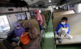 Sejumlah penumpang berada didalam kereta api jarak jauh di Stasiun Senen, Jakarta, Selasa (21/12). Jelang libur Natal dan Tahun Baru kepadatan penumpang kereta api jarak jauh mulai terlihat di stasiun Senen.Prayogi/Republika (FOTO : Prayogi/Republika.)